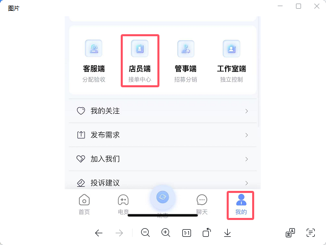 入驻流程:打手进入系统→点击底部我的→点击店员端