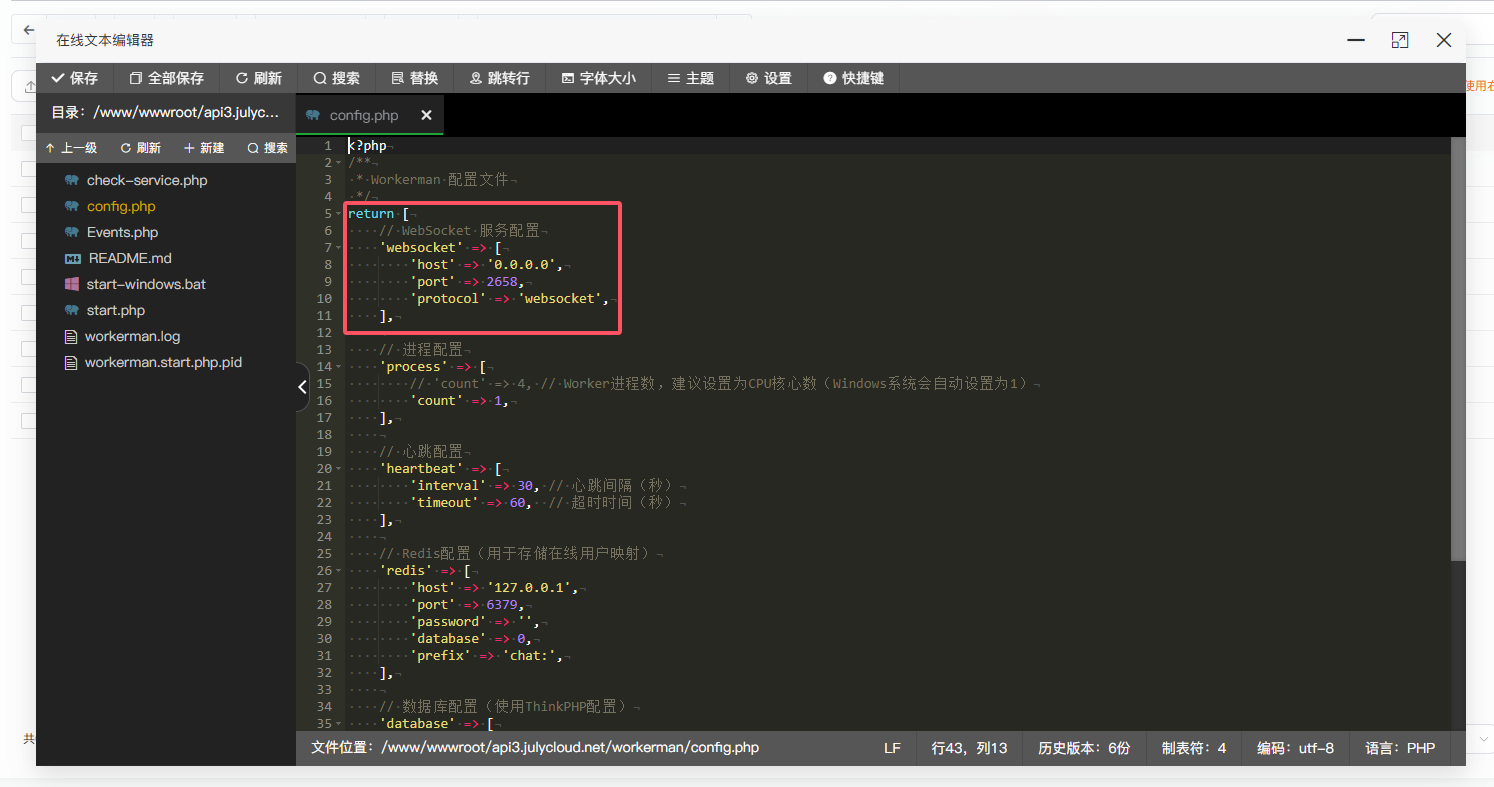 注意:这里的端口可以随意修改,修改在workerman/config.php中的9行,42-43行域名要更改成自己的