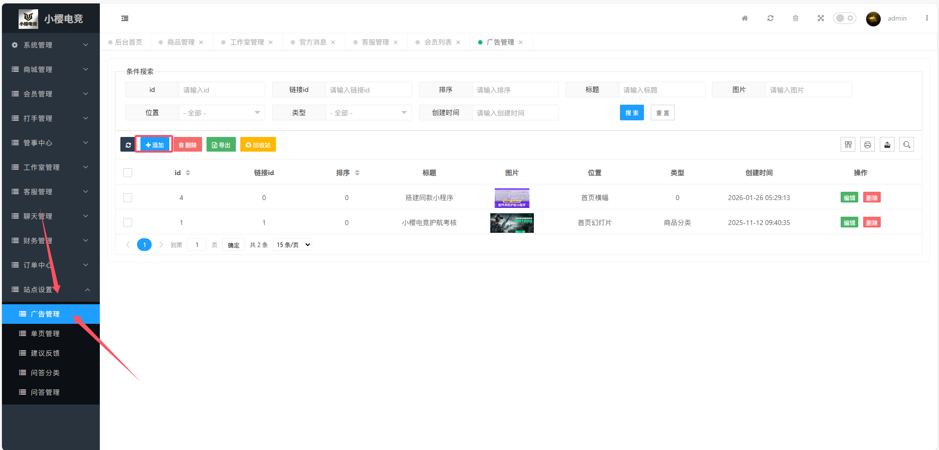 登录后台-》站点设置-》广告管理-》