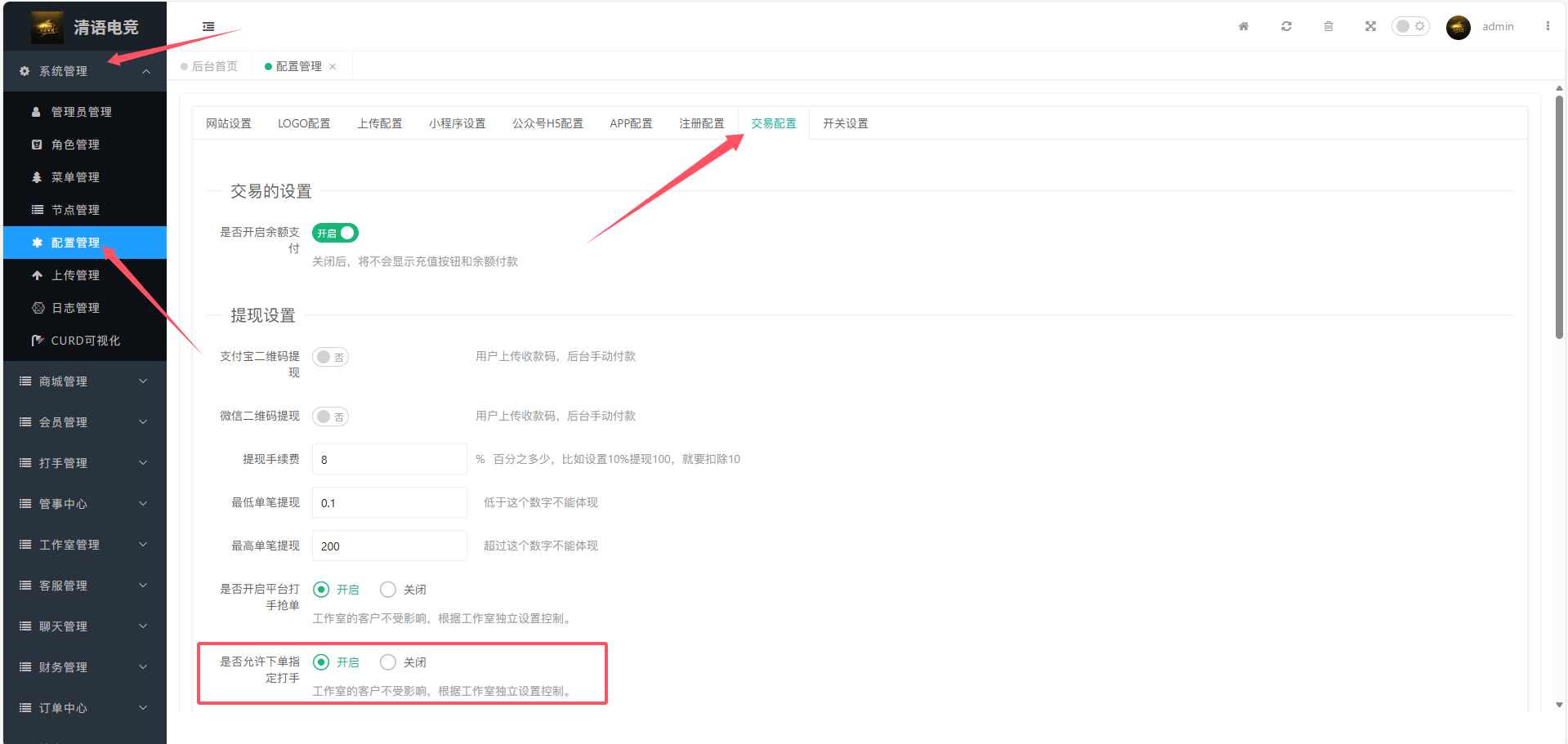 登录后台- 》系统管理- 》配置管理- 》交易配置,即可找到“是否允许下单指定打手”