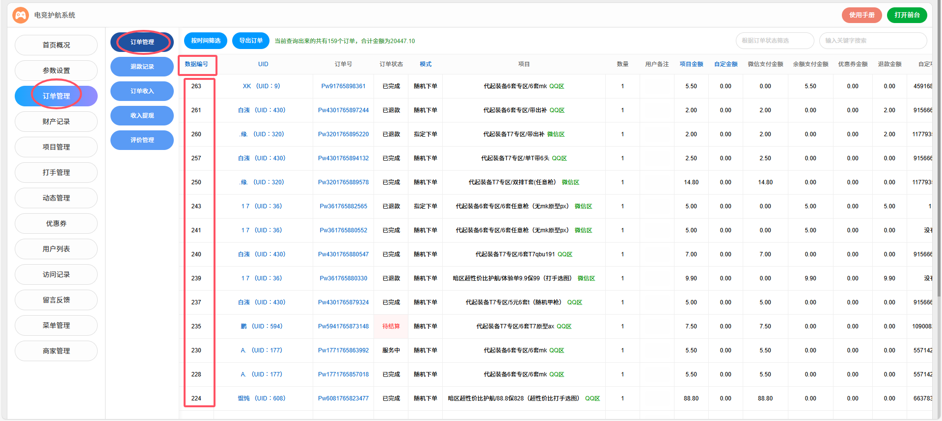 在后台→订单管理点击的结单,系统是不会自动把钱分成给打手的