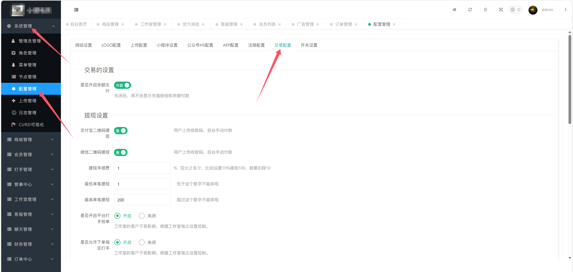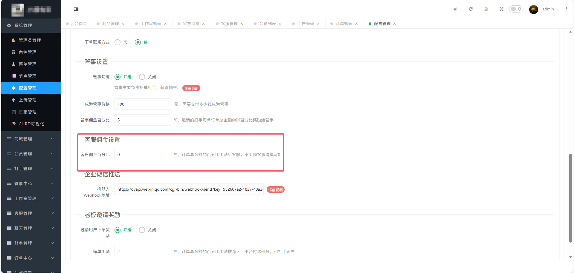 可以在:系统管理-》配置管理-》交易配置-》往下滑找到客服佣金设置
